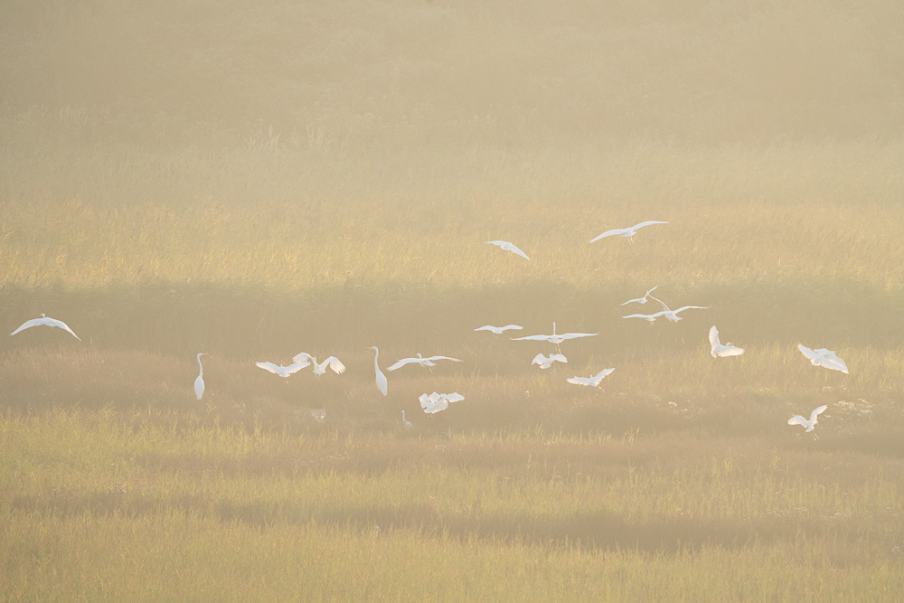 Vanaf zonsopkomst verzamelden er minimaal 13 Kleine Zilverreigers en 8 Grote Zilverreigers zich in de Westenschouwense inlaag, hoek N57/duinrand.