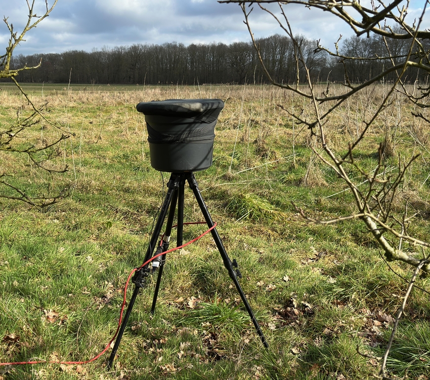 Situatie telpost en omgeving. Microfoons met windkap in emmer tegen directe windinvloed. Vrij in het veld.