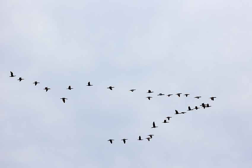 De kop van een vlucht van 34 aalscholvers.