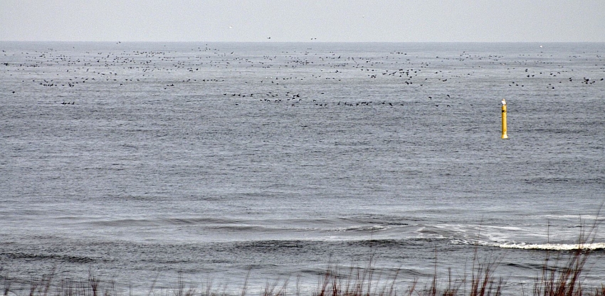Stroom zee-eenden, zoals dat 40 minuten lang naar zuid passeerde, met kleine variaties in dichthedenvogels. Sfeerbeeld.