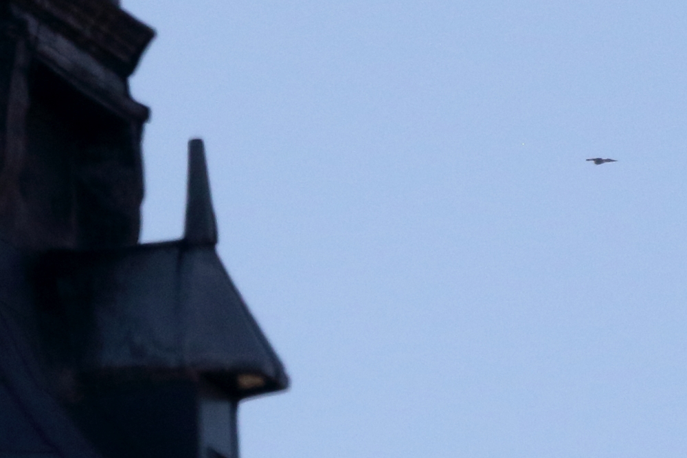 Afglijdend naar ZO achter de toren van de Oude Kerk in Amsterdam