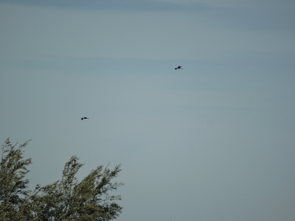 Twee stuks een klein uurtje aanwezig ca 500m westelijk van de telpost. 1 Verdween uiteindelijk richting oost nr 2 ging zuidwestelijk richting Willemstad.